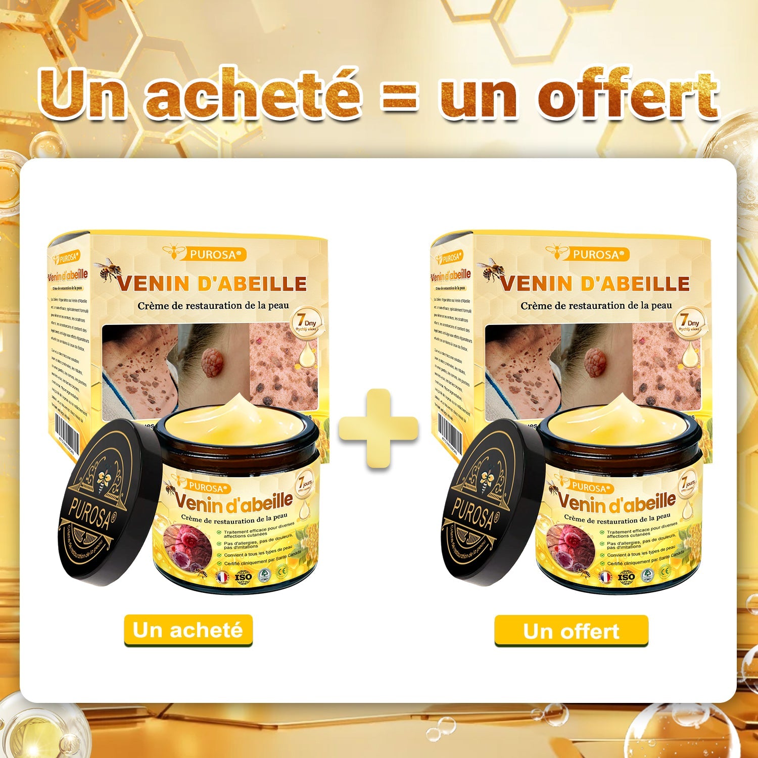 Cliniquement testée par des dermatologues, PUROSA® Venin d'abeille Crème de restauration de la peau peut offrir des améliorations visibles des rides et du relâchement cutané en seulement 7 jours.